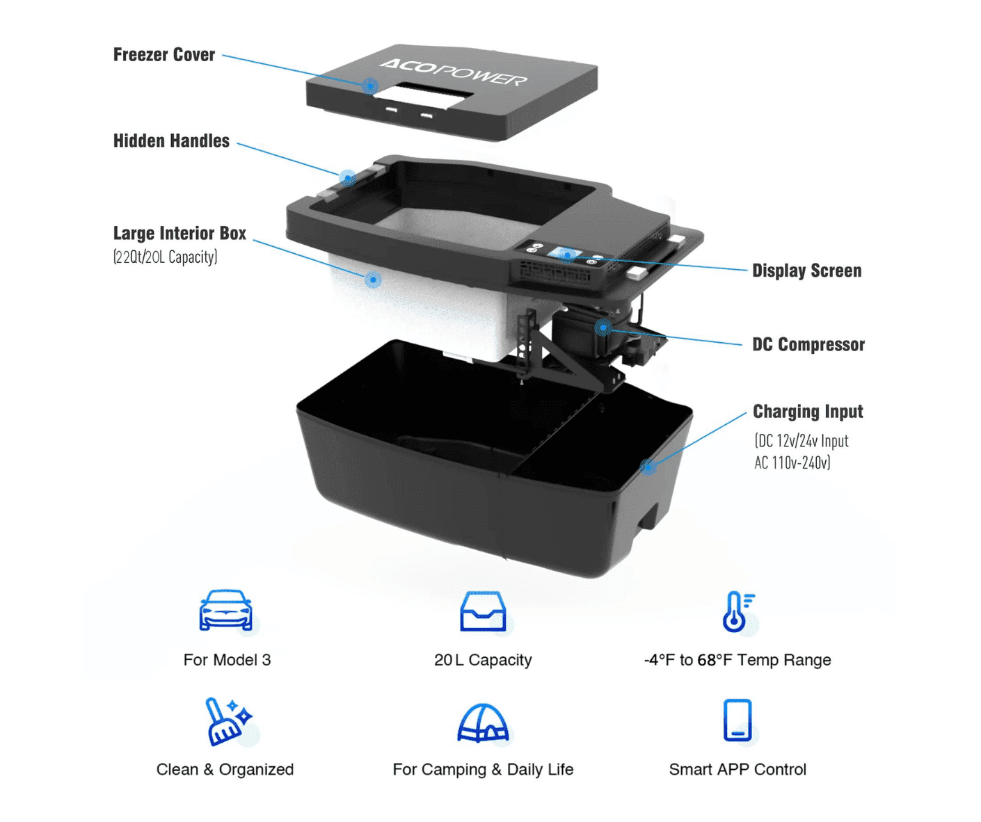 Tesfridges offers practical storage without the need for ice, providing 20L & 35L & 36L capacities for Model 3 & Model Y & Model X. Say goodbye to wasted space and hello to efficient cooling.