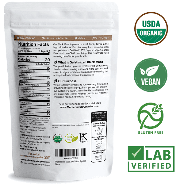 100% NATURAL, SAFE & VEGAN: Our maca root powder is naturally packed with vitamin D, calcium, iron, and potassium, making it a highly nutritional superfood. Purity is essential to Mother Nature Organics products which is why our organic maca root powder is gluten-free, non-GMO, vegan, vegetarian-friendly, allergy-free, and doesn't contain harsh additives or preservatives. Safe and effective, this maca gelatinized powder will ensure you are getting optimum potency and efficacy in every serving!