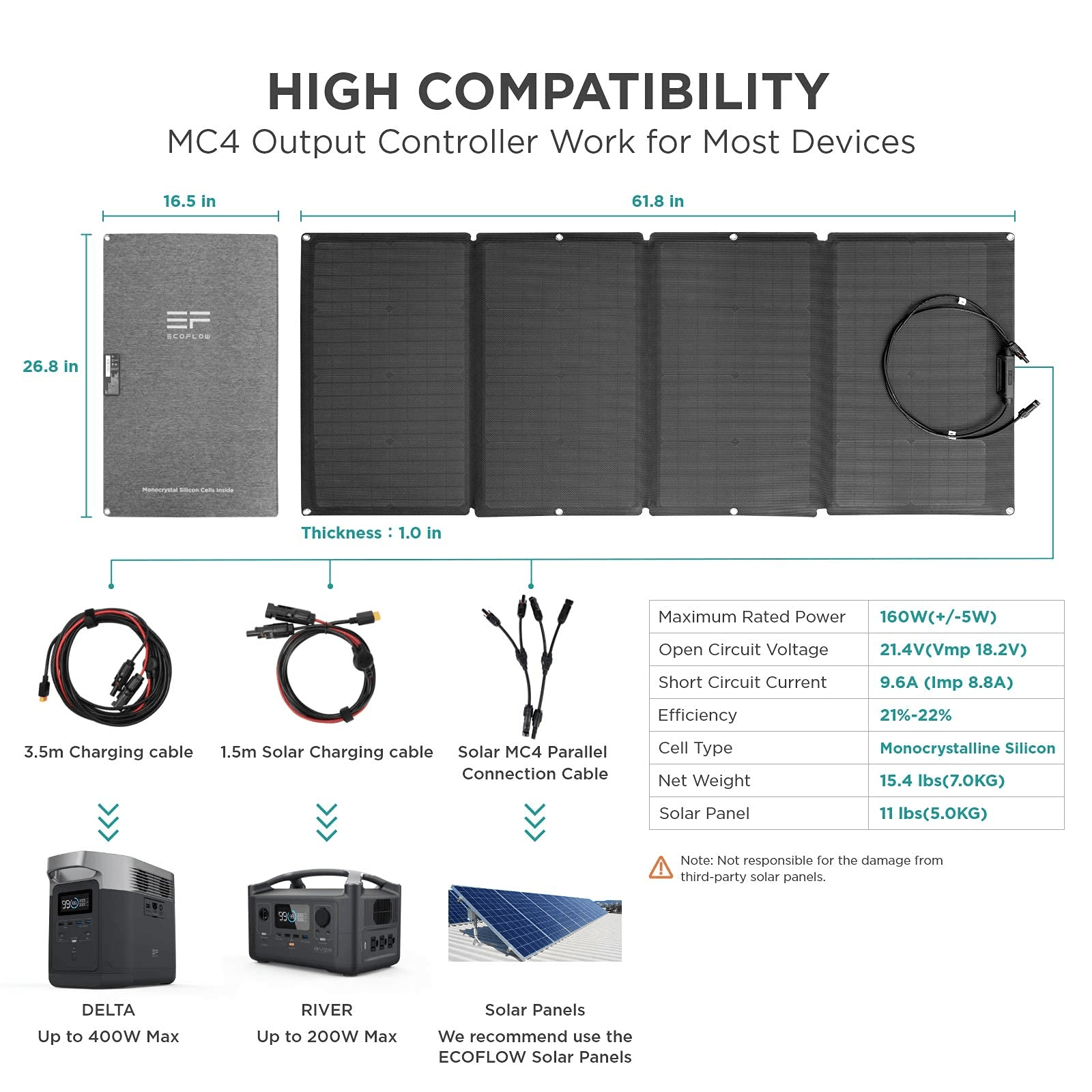 Don't settle for anything less - The EcoFlow 160W Solar Panel is equipped with 32 premium monocrystalline silicon cells, and a universal MC4 connector that is compatible with other products on the market. Backed by a 12-month warranty, you can trust in the durability and reliability of this solar panel.