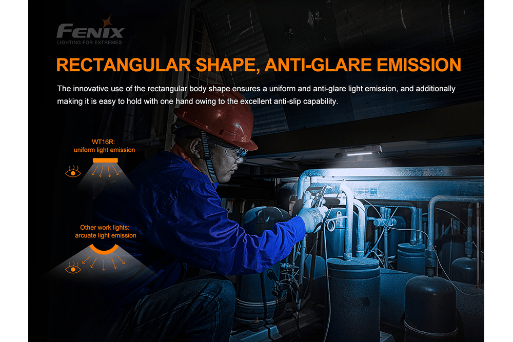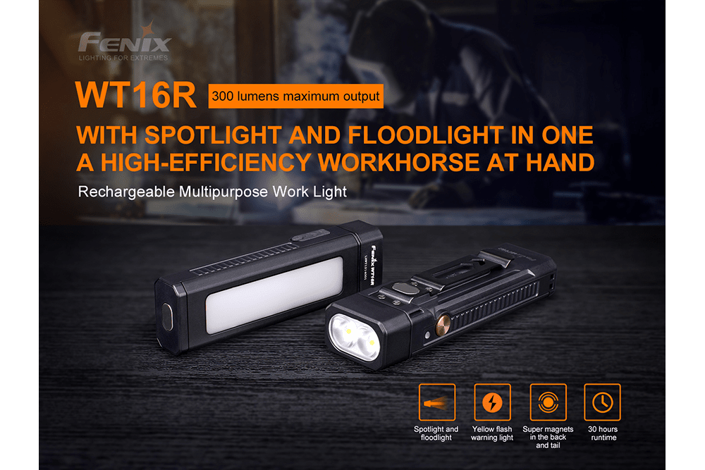The Fenix WT16R is a cutting-edge rechargeable work light that emits up to 300 lumens. It is equipped with three lighting functions: spotlight, floodlight, and yellow flash. It also has a side light and a magnetic back which allows for multiple positioning options. The WT16R is suitable for industrial use and is conveniently attachable to almost any metal surface for hands-free operation. With a maximum beam visibility of 377 feet and an IP66 water resistance rating, the WT16R is powered by a 2000 mAh Li-polymer battery that can be charged using a USB Type-C Charging port. Get the Fenix WT16R now!