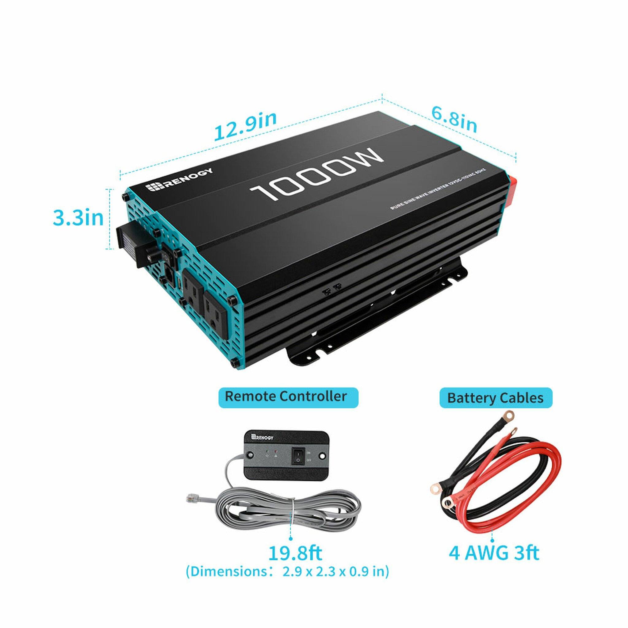 The Renogy 1000W 12V Pure Sine Wave Inverter is perfect for most off-grid systems, whether for a van, semi-trucks, 5th wheels, cabin, or any remote location needing power. The Renogy 1000W Pure Sine Wave Inverter acts as a DC to AC converter that allows you to power your household appliances. The advanced Renogy pure sign wave technology will protect and extend the life of your electronics and appliances. With its quiet and high inductive loads, there are no strange buzzing sounds when your electronics are turned on and allow them to run smoother, cooler and quieter.