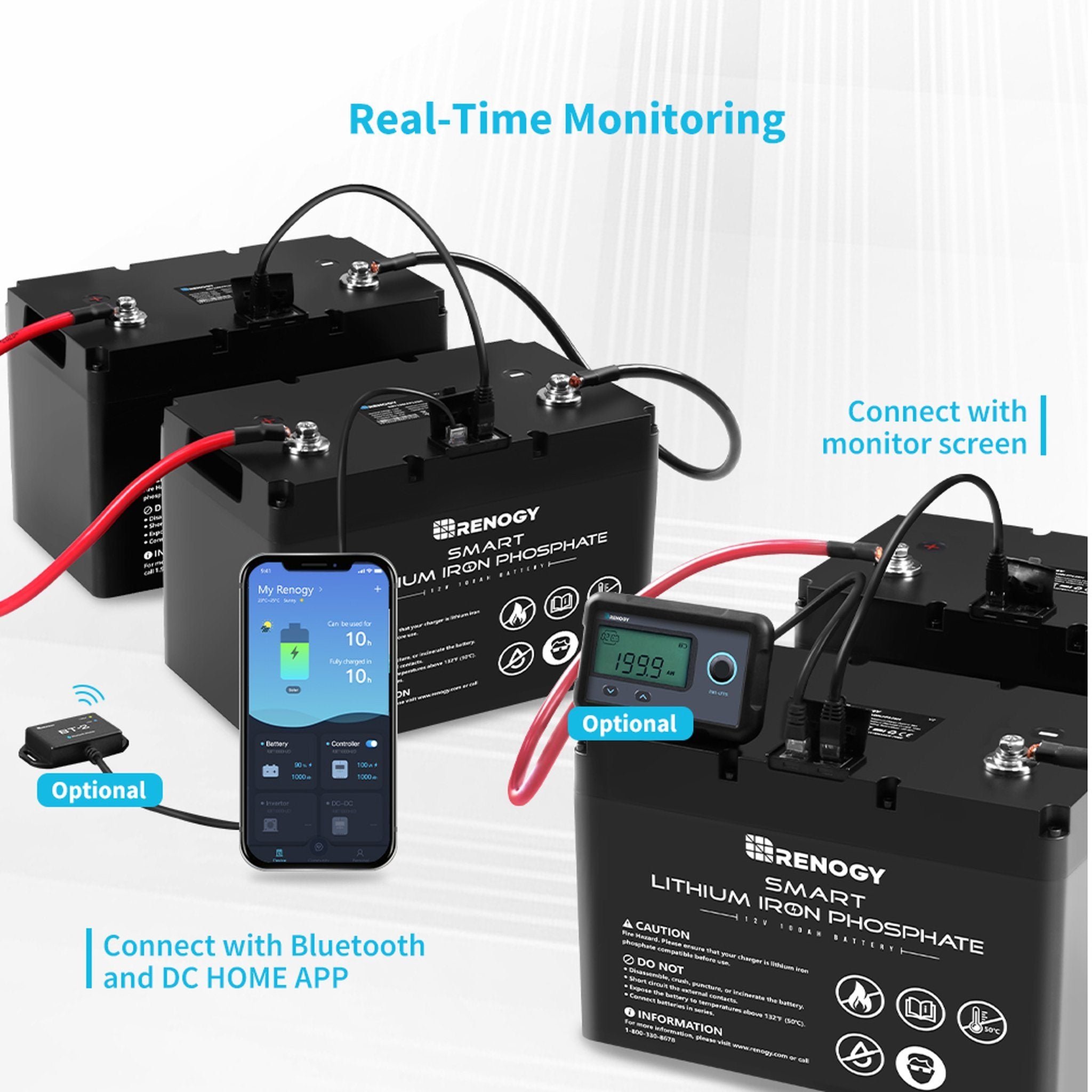 Real-Time Monitor: The battery features a RS485 communication port—enabling communication between batteries, external devices (BT-2 Bluetooth Module or Monitoring Screen) and host computers for you to monitor the charging status in real-time on the Renogy DC Home APP.