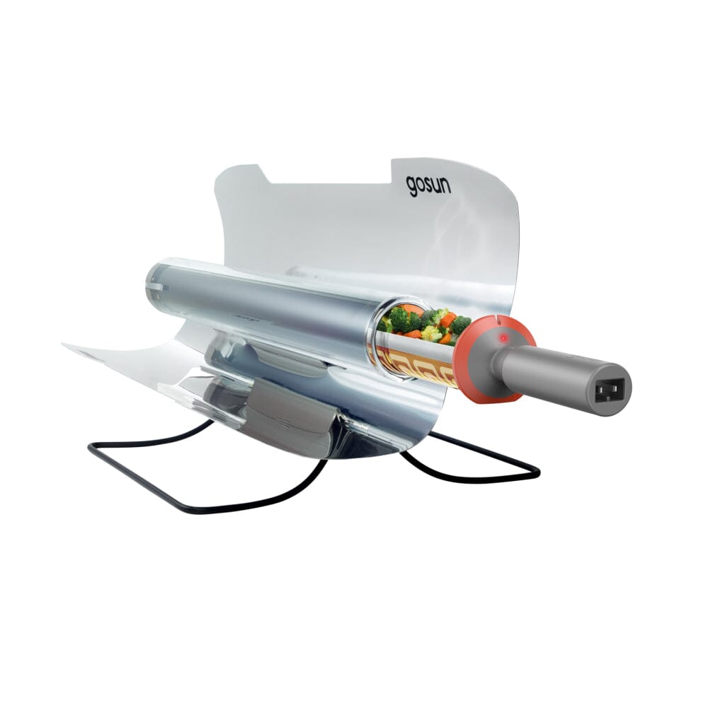 Breakthrough Hybrid Solar Oven that can cook at night. Harness the Sun to cook food during the day and/or use 12V electricity to cook at night or indoors. Cook fuel-free meals in 20 minutes to feed two people. Vacuum insulated oven is cool to touch on outside while oven temps remains 350°F. Plug into any 12 volt DC power source or a GoSun Power Bank Package includes Carrying Case, 8 x Silicone Trays, and Powercord.
