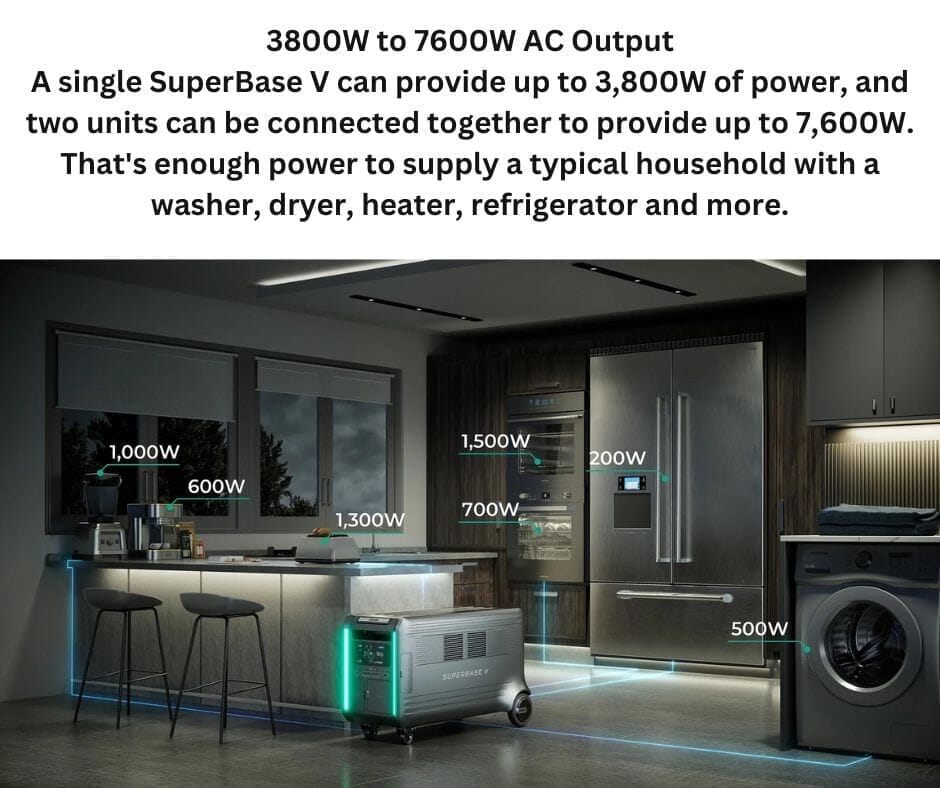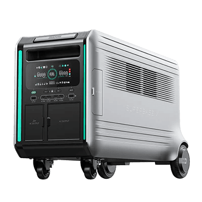 Combining AC and solar power, SuperBase V can charge up to 5,150W on its own, or 6,600W when connected to a Satellite Battery. Whether you're planning for an emergency or using SuperBase V to manage your household energy consumption, faster is always better.SuperBase V can charge up to 3,000 W using solar power alone. This is enough to fully charge the main unit in 2 to 3 hours. While we offer our own solar panels, SuperBase V is compatible with a wide range of other manufacturers' solar panels from 12V to 150V and can be easily integrated into your existing solar system.You can charge SuperBase V from a 120V or 240V outlet AC. At 240V, SuperBase V can draw 3,600W at its AC input and recharge in about 2 hours.